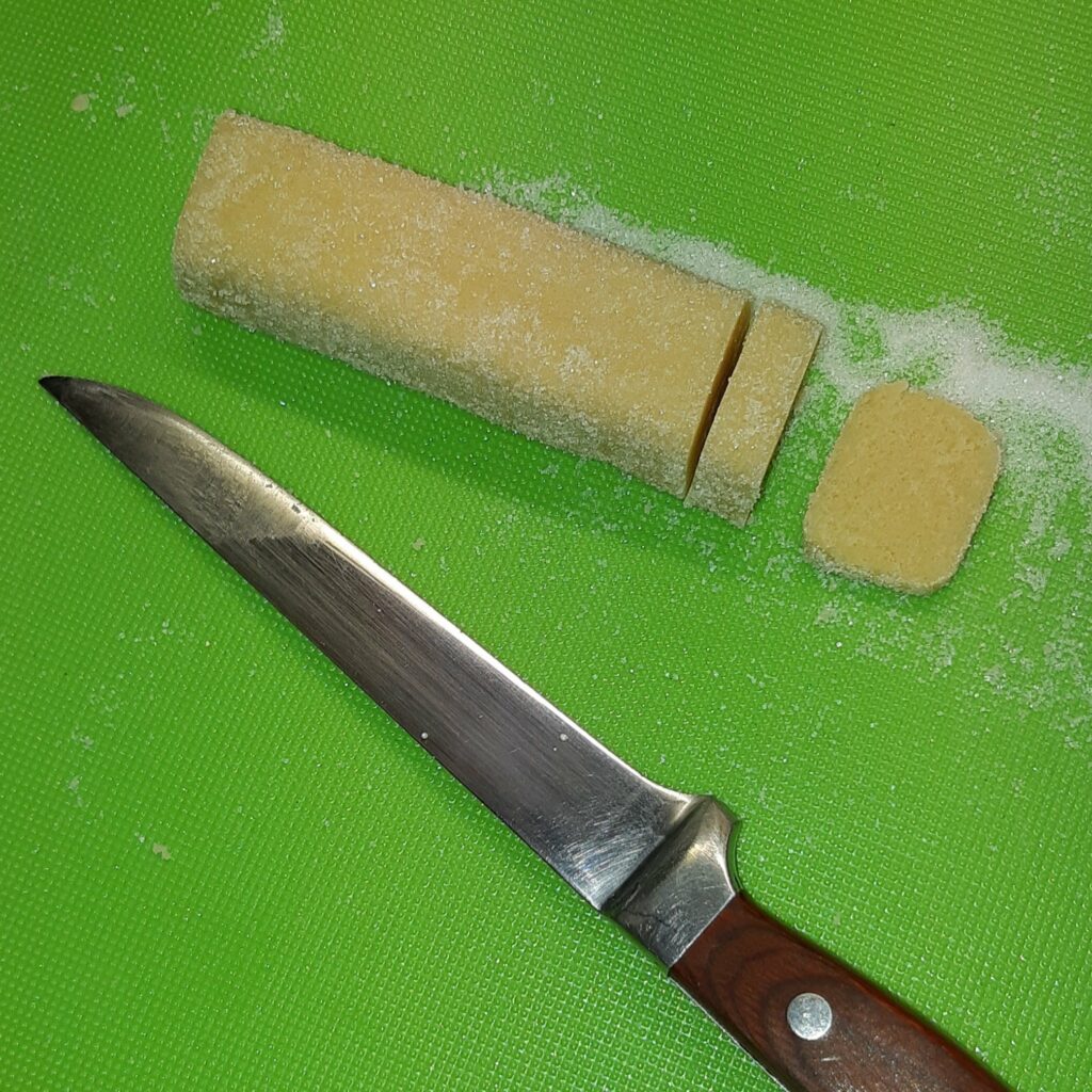 - Vyválíme válec, který můžeme lehce zploštit. Posypeme zbylým cukrem a zabalíme do potravinářské folie. Necháme alespoň 30 minut v lednici.